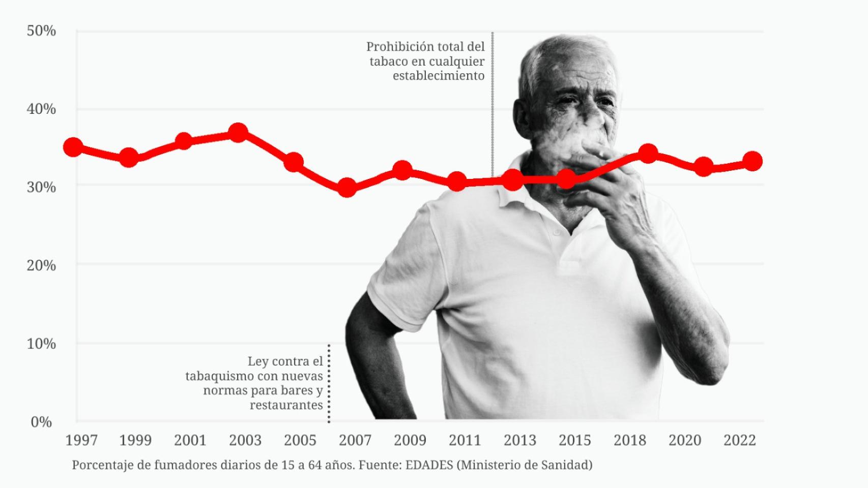 La norma trajo sus frutos. Como revela el EDADES, la serie más completa sobre consumo de sustancias en España, en 2007 se registra el porcentaje más bajo de la historia, un 29,6%.