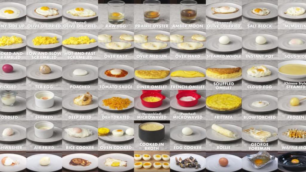 El canal de Youtube Bon Appetit ha publicado un vídeo en el que recoge y explica hasta 59 formas diferentes de cocinar un huevo usando todo tipo de técnicas y utensilios desde el moderno huevo a baja temperatura sous vide, los socorridos huevos cocinados en el microondas o los curiosos huevos-nube hasta algunas locuras como los huevos congelados, el huevo deshidratado, la tortilla suflada o la manera de cocinar un huevo en lugares o electrodomésticos que no fueron diseñados para tal fin como una sauna, el motor de un coche, una olla arrocera, una freidora de aire caliente o un lavaplatos.