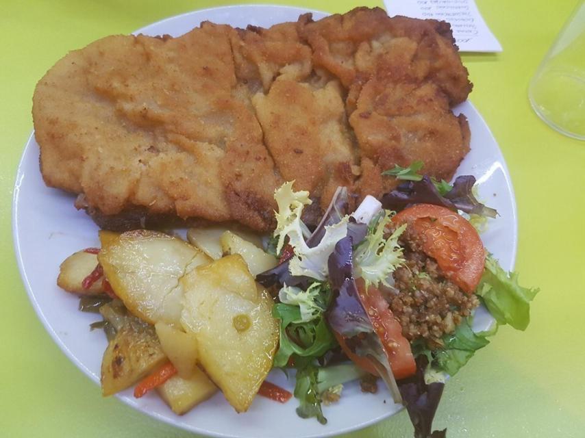 Este local situado en el madrileño barrio de La Latina (Plaza de La Cebada, 12) elabora su cachopo con ternera IGP asturiana. Está relleno de jamón serrano y queso de Abredo, mide 25 x 40 cm, se sirve con patatas y ensalada y cuesta 25 €.