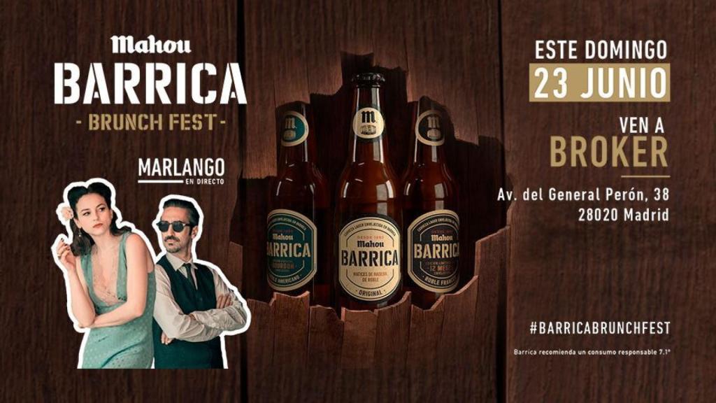 Cada domingo hasta el 28 de julio se celebrará un brunch maridado con las cervezas Barrica de Mahou en un restaurante diferente de Madrid. El primero será el domingo 23 de junio en Broker, donde han preparado un menú de brunch especial para que sea perfecto tomarlo con estas cervezas. Además, el grupo Marlango se encargará de amenizar la velada con un concierto a las 14:00.