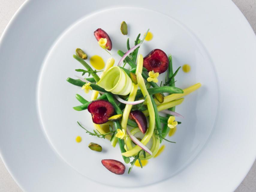 El entorno privilegiado en el que se sitúa el restaurante permite al chef diseñar platos con los mejores ingredientes franceses e italianos, muchos de ellos cultivados en la finca ubicada en el patio trasero del propio restaurante.