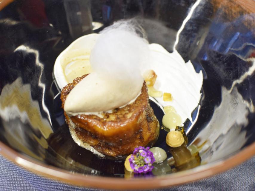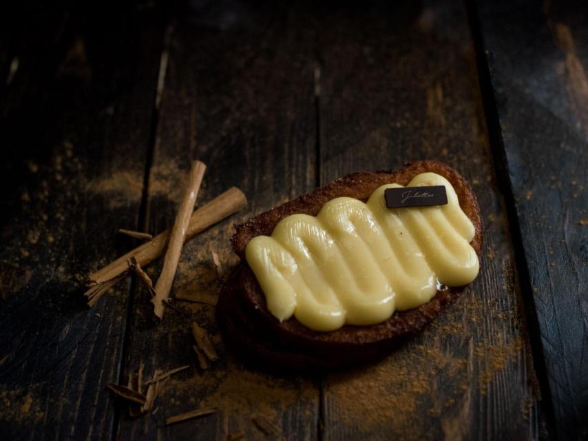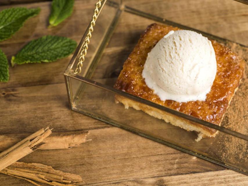 Las elaboran con pan brioche y las dejan a remojo en una suerte de ponche que elabora con leche de oveja, nata con aromáticas, piel de naranja y limón y canela. En el momento de servirlas, preparan un caramelo con azúcar y mantequilla, sobre el que disponen la torrija para freírla con un poco de este ponche. Así se crea la magia, dando a las torrijas un exterior caramelizado, como con toffe y un interior cremoso, acompañadas de una bola de helado de vainilla. Si quieres tratar de emularlas en casa, aquí tienes la receta.