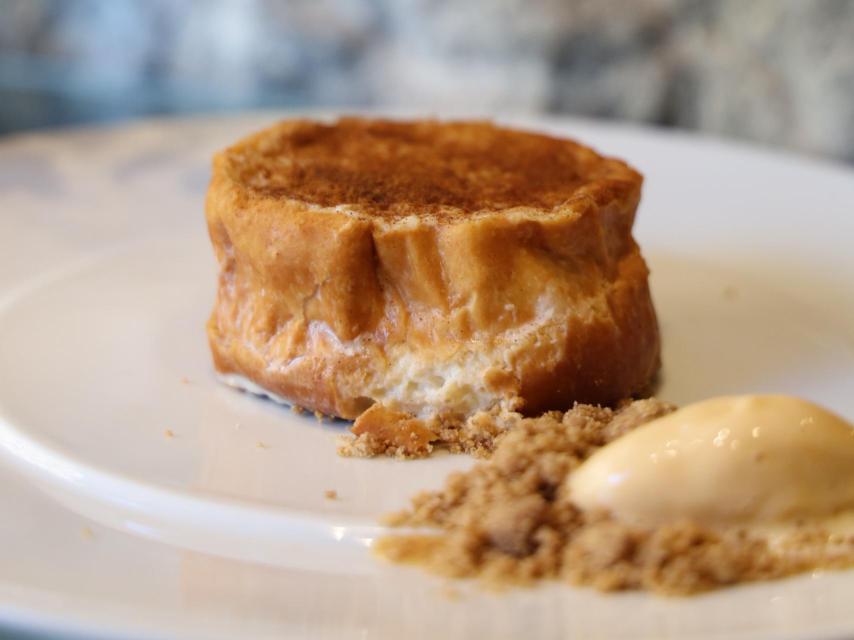 La elaboran con brioche artesano, que preparan ellos mismos en su obrador, que empapan en leche infusionada con limón, naranja, azúcar y canela durante 24 horas. La terminan, en vez de freírla, sellándola a la plancha, lo que la hace mucho más ligera. El el restaurante la acompañan de helado de caramelo artesanal y un crumble de manzana.