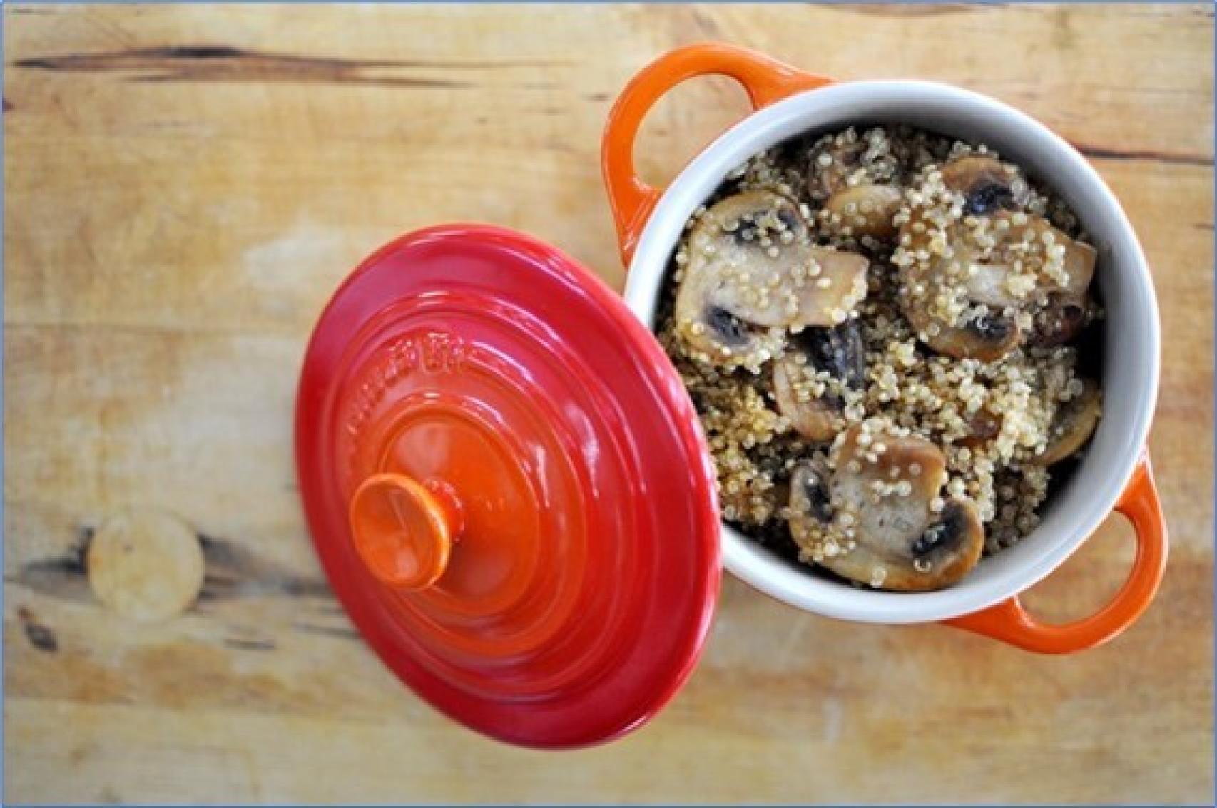 La foto superior es el ejemplo perfecto de que menos es más, la regla de oro en este tipo de fotografía, simplemente con la madera de fondo, que crea un ambiente cálido, y la tapa de la olla, que pone la nota de color que le falta a la quinoa y da volumen a la composición, se consigue una fotografía visualmente muy atractiva con el plato como único protagonista. La mayoría de las veces no hace falta más.