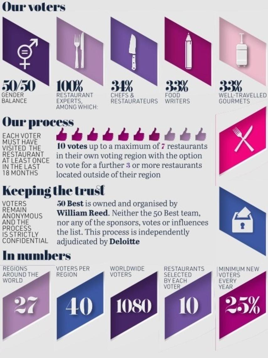 Detrás de las votaciones hay un total de 1.080 expertos de la industria de la restauración compuesto por un 50 % de hombres y 50 % de mujeres, de los cuales un 34 % son chefs y restauradores; un 33 % periodistas gastronómicos y otro 33 % «gourmets muy viajados», como los denomina la organización. Por su labor no reciben ningún sueldo ni retribución.