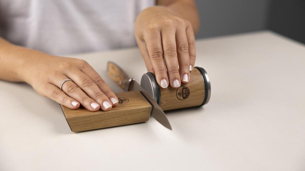 Los afiladores Horl son obra de un hijo diseñador con un padre ingeniero, se fabrican en la Selva Negra con maderas procedentes de sus bosques y son ensamblados en talleres locales. Están pensados para afilar tanto cuchillos europeos como japoneses y su uso no puede ser más simple. El cuchillo se fija a un bloque de madera que tiene en su interior unos imanes para mantener el ángulo adecuado durante el proceso de afilado. Este se realiza haciendo girar el rodillo tal como se ve en la imagen, primero con el disco de diamante y después con el de cerámica.