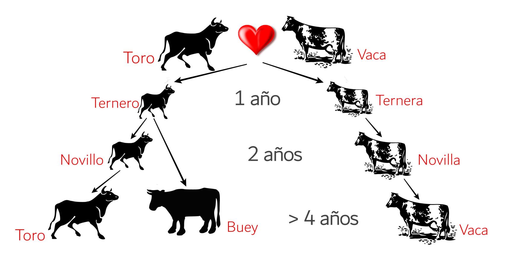 En definitiva, de la unión de un toro y una vaca nace una cría que puede ser hembra o macho. La hembra pasará a ser ternera, novilla, y vaca. El macho pasará a ser ternero, que puede coger dos caminos. Si no se castra, será un novillo y se convertirá en toro. Y, si se castra en el primer año de vida, empezará su camino hacia convertirse en buey a los cuatro años.