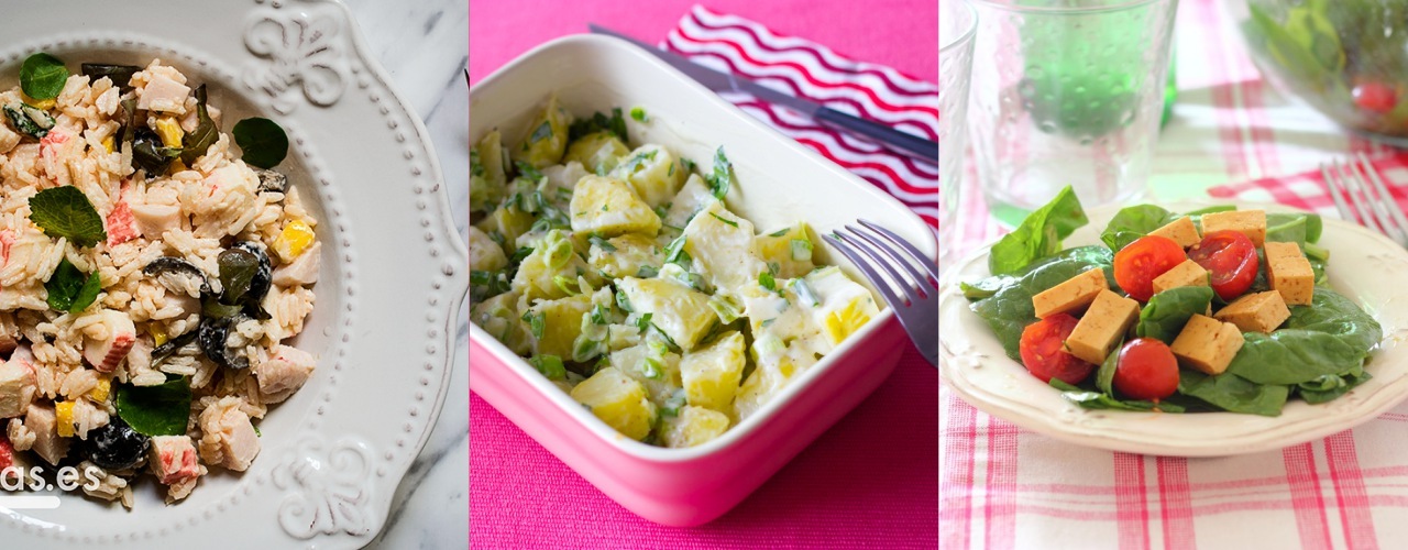Así pues te proponemos estas tres ensaladas, una ensalada de arroz en la que si, como a mí, no os hacen mucha gracia las barritas de surimi podéis substituirlas por cualquier otra proteína ( restos de pollo asado, huevo duro, …) o simplemente omitirlas.