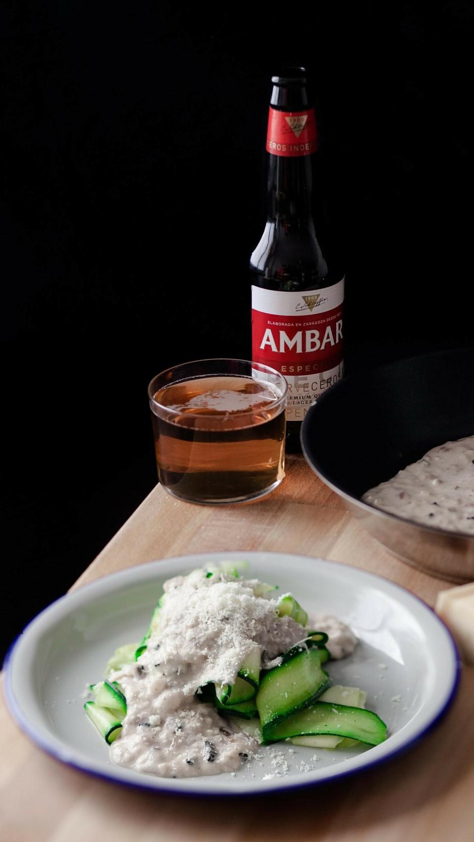 Desde Ambar nos traen una cerveza especial para cocinar un plato minimalista, sano y lleno de vida. Hemos preparado unos pappardelle de calabacín, servidos con una bechamel de trufa quebrada, reducida con el dulzor de la pilsner.