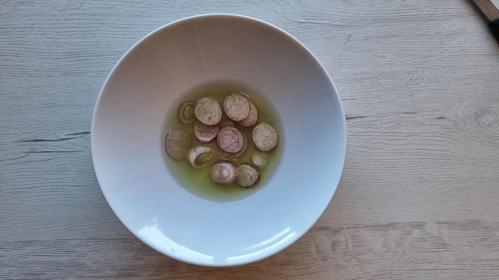 Mientras tanto, encurtir la chalota. Pelar y picar las chalotas en forma de discos y sumergir en la mezcla de vinagres con sal y azúcar. Dejar reposar allí al menos 2 horas.
