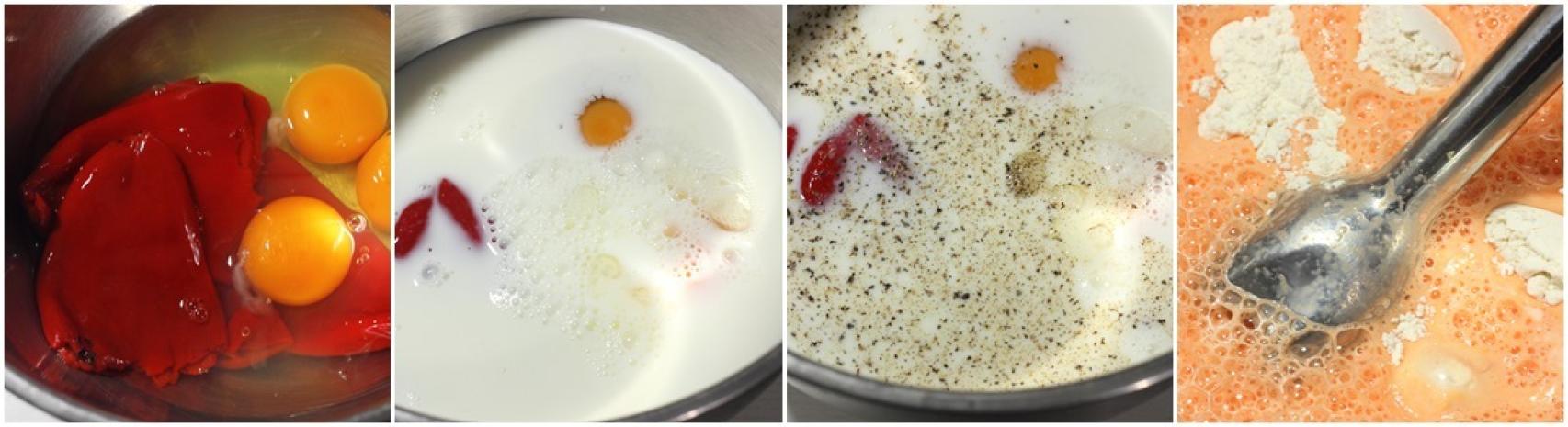 En un bol ponemos los pimientos del Piquillo asados, los huevos y la leche, añadimos la sal y pimienta al gusto y trituramos con la batidora. Echamos la harina de trigo y la levadura tipo Royal y seguimos batiendo hasta que no queden grumos.