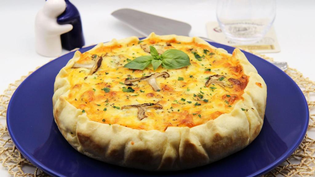 Espolvoreamos la superficie con la mezcla de quesos rallados, añadimos orégano y decoramos con unas setas finamente laminadas.