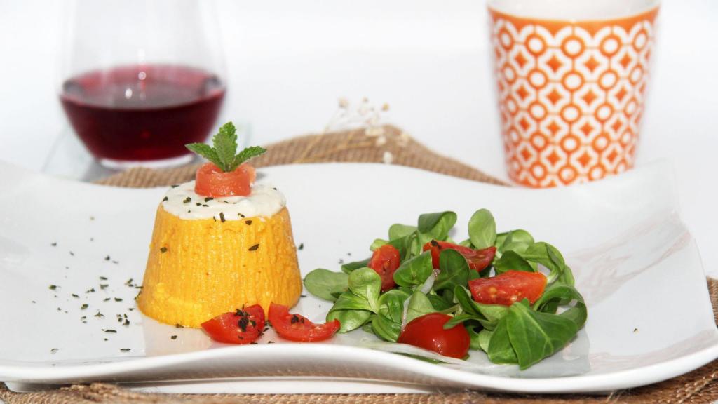 Flan de zanahoria y salmón ahumado con salsa de queso Gorgonzola