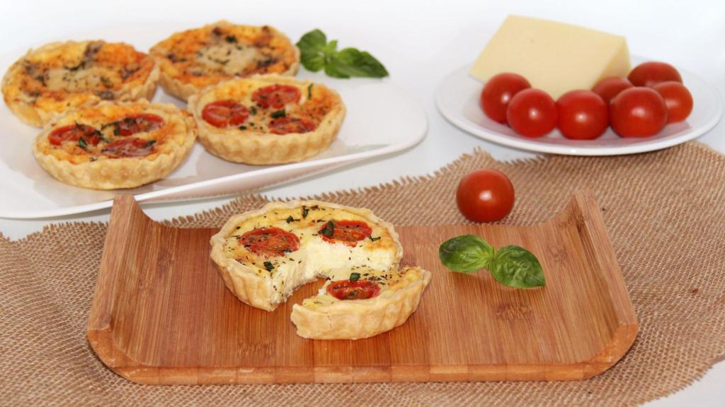 Servimos las mini quiches de queso y tomates cherry tibias para disfrutarlas en todo su esplendor, aunque a temperatura ambiente también estás muy ricas.