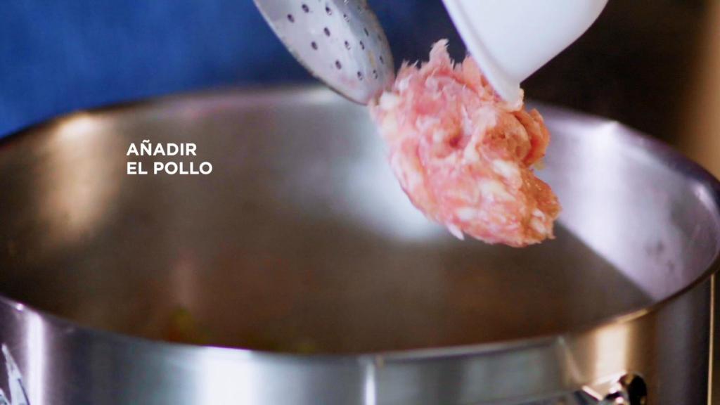 Añadimos también la carne picada de pollo bien desmenuzada y damos unas vueltas para que cambie de color.