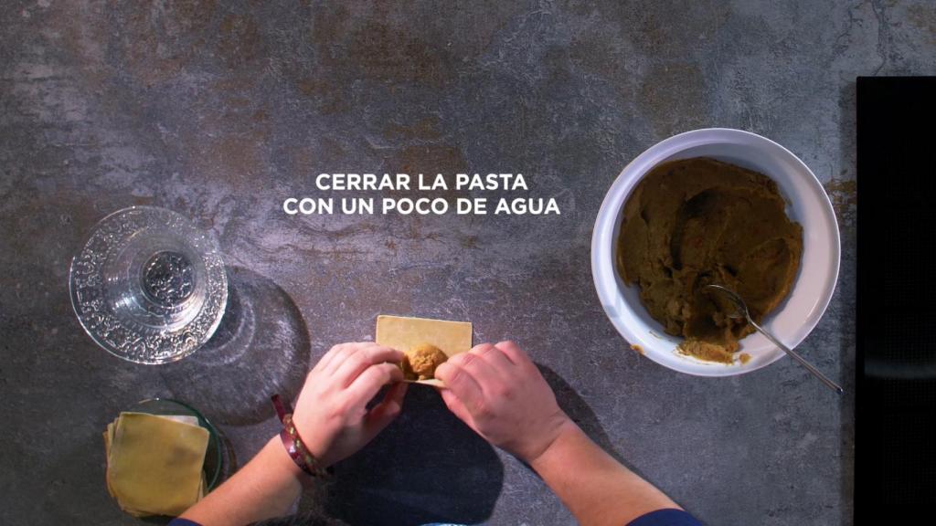 Usaremos 4 hojas de pasta wontón por comensal y 25 g de nuestro relleno recién elaborado en cada una de las láminas de pasta.