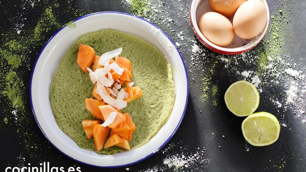 Crepes de té matcha con papaya y chips de coco, postre ligero y saludable