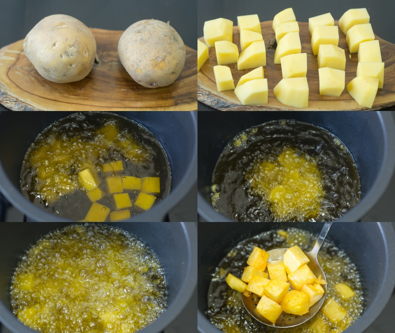 Pelamos las patatas, las lavamos, las secamos bien, y las cortamos en dados de 2,5 cm de lado. En una sartén honda o freidora ponemos a calentar abundante aceite a fuego medio-bajo en la que confitaremos las patatas a fuego lento hasta que estén tiernas.