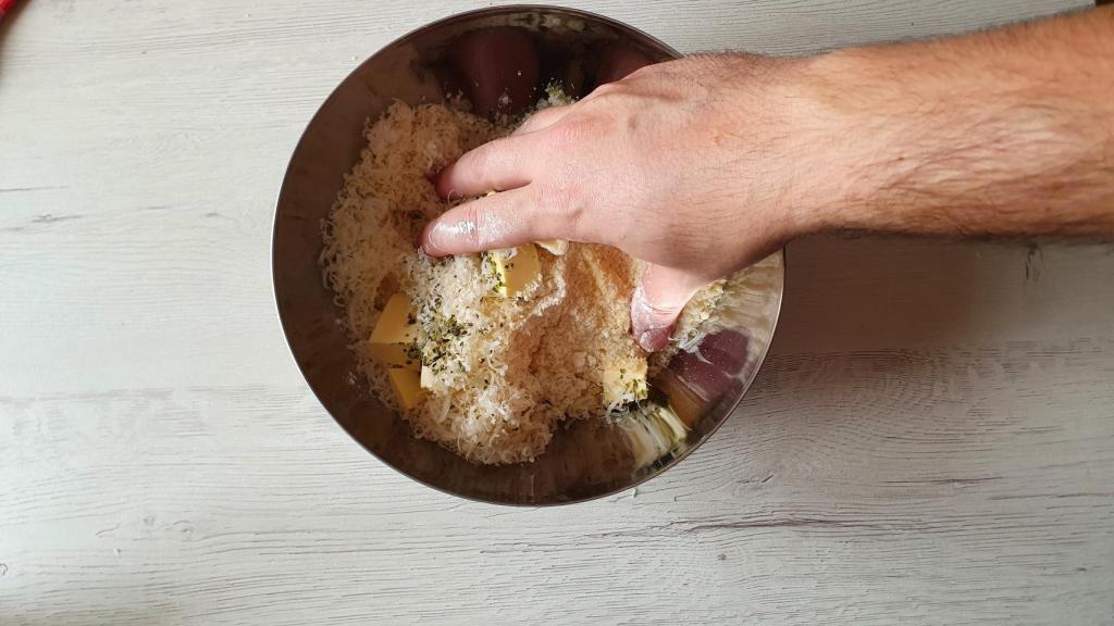 Y lo segundo maravilloso de esta preparación es que sirve de pretexto perfecta para utilizar esas cuñas de queso viejo que sólo dan vueltas en la nevera y no se sabe muy bien qué hacer con él. Elaboraciones así, siempre hay que hacer de más porque aguantan bien las inclemencias del tiempo, no ocupan sitio en la nevera porque se conservan a temperatura ambiente y porque están buenísimas. Si me apuras, el símil perfecto son las patatas fritas. Nunca son suficientes; pues esto igual.