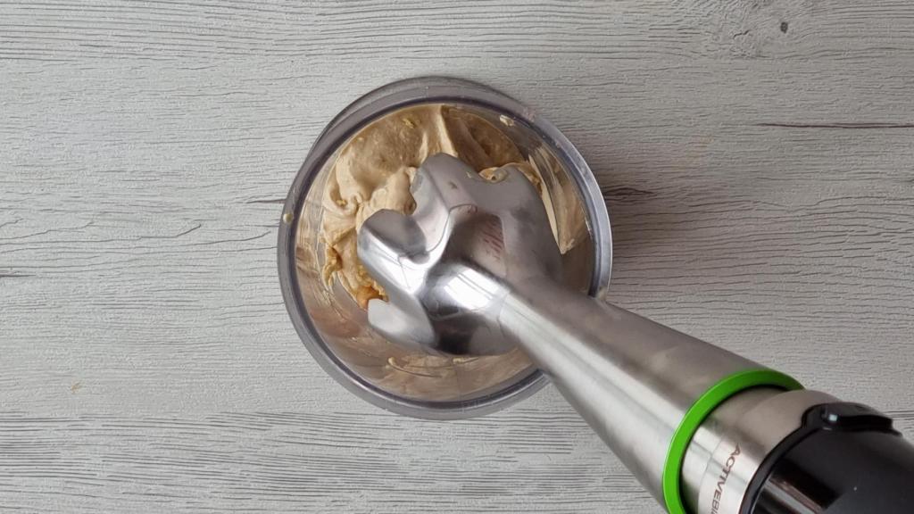 Una vez tenemos listos los garbanzos, pelar y quitar el germen al ajo. Agregarlos a una batidora o vaso mezclador junto con la mitad del zumo de limón y la tahina. Triturar muy bien hasta que se haga una pasta.