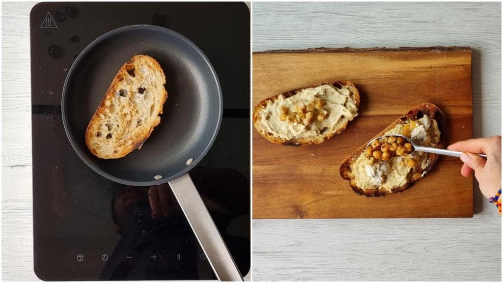 Y, de tener por un lado hummus hecho y por el otro lado unos garbanzos fritos, puede surgir esta tosta de hummus y garbanzos fritos que se monta en un periquete. El truco es que el hummus no esté muy frío y que los garbanzos fritos estén calientes y, después, buscar un buen queso fresco cremoso que haga de contraste junto con la hierbabuena por encima.