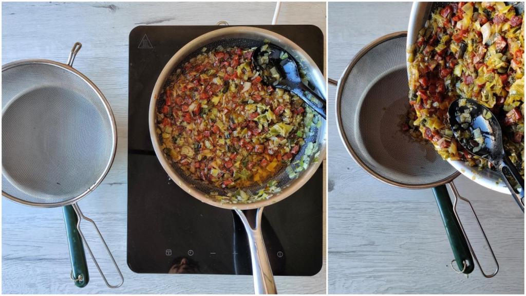 Colar el sofrito de chorizo y aplastar bien para que las verduras suelten todo el aceite. Reservar el aceite para la masa.