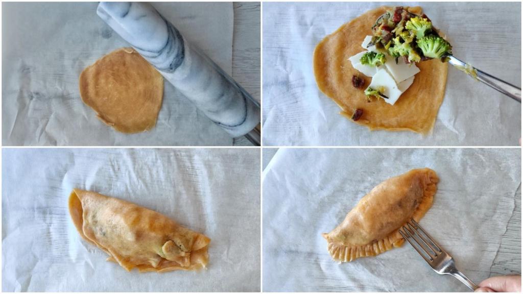 Separar una bola pequeña de la masa. Estirar con el rodillo y dar forma redondeada con un cuchillo. Colocar queso al gusto y una cucharada de sofrito de chorizo y brócoli; humedecerse los dedos y plegar la masa con mucho cuidado de que no se rompa. Cerrarla con ayuda de un tenedor.