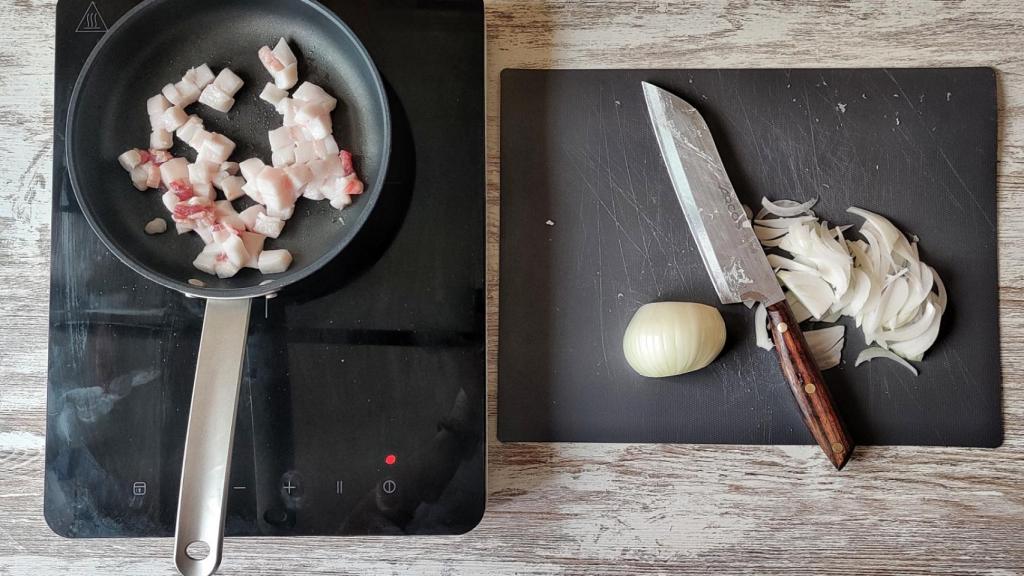 Pelar la cebolla y cortarla en juliana o en tiras finas. Cortar la panceta, o el beicon, en dados gruesos y freír en una sartén sin aceite a fuego medio para que se dore y funda toda su grasa. Se dorará en su propia grasa. Pasados unos 5 minutos, cuando esté cocinada, retirar un poco de esa grasa que ha soltado y agregar la cebolla cortada en juliana o tiras. Sazonar y cocinar 5 minutos más para que la cebolla se poche, a fuego suave removiendo de vez en cuando.