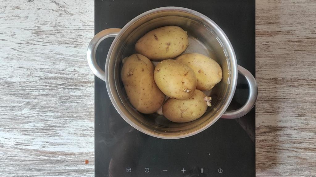 Cocer las patatas, pelarlas y cortarlas.