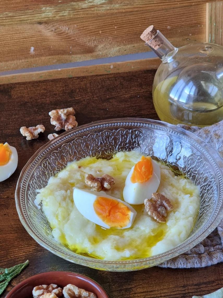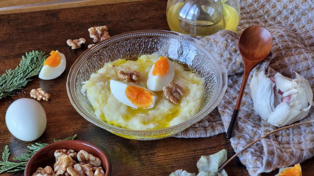 Servir el atascaburras con los huevos cocidos, las nueces y aceite por encima
