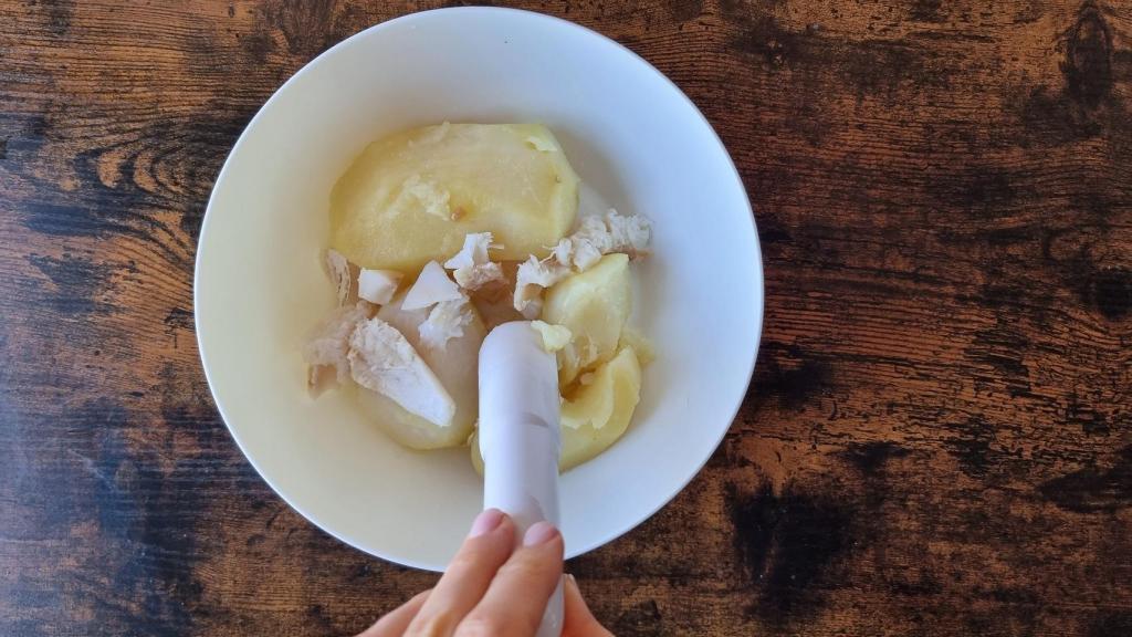 Cuando las patatas estén cocidas, pelar con cuidado de no quemarnos los dedos. Y empezar a machacar con la ayuda de un tenedor y luego de un mortero. Añadir el trocito de ajo sin el aceite y también el bacalao cocido. Majar constantemente, tardaremos unos 15 minutos hasta que esté todo bien integrado. Tendremos que ir incorporando un poco del caldo de cocción del bacalao hasta que quede de la densidad perfecta.