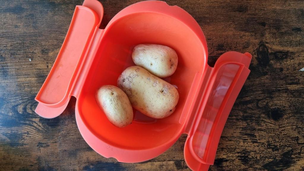 Cuando tengamos el bacalao ya listo será el momento de cocer las patatas. Se pueden cocer las patatas en agua, siempre con piel, o lo podemos hacer en el microondas dentro de algún recipiente de silicona o en un bol. Habrá que poner un poco de agua en la base y siempre tapar. Con el recipiente o con un poco de papel film. Se cocerán las patatas unos 15 minutos hasta que estén bien tiernas.