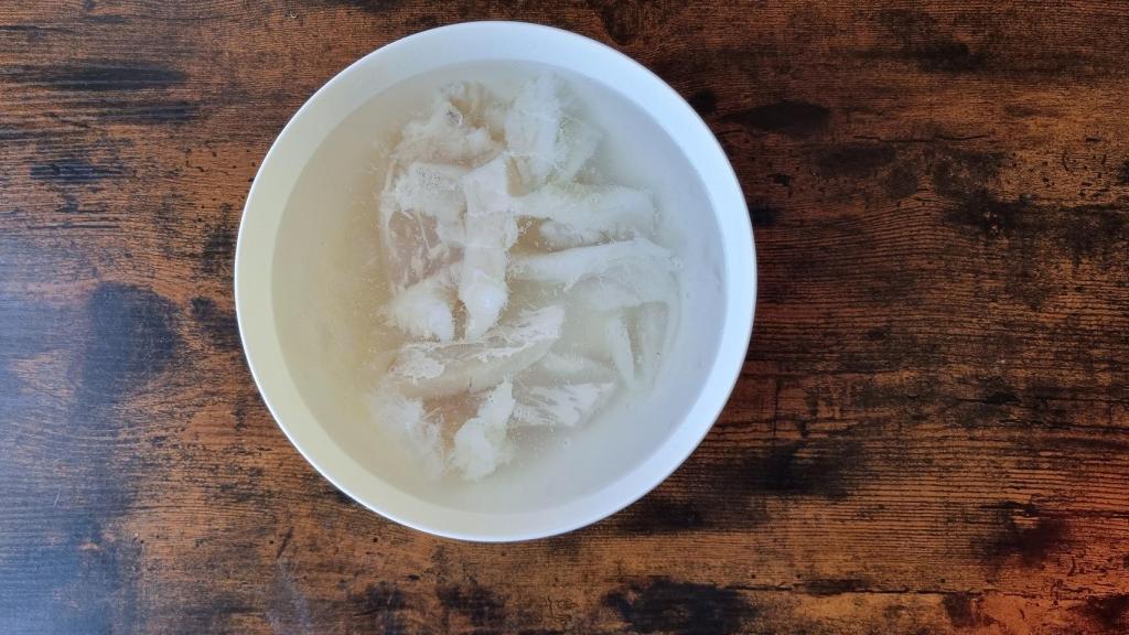 Desalar el bacalao previamente durante 24 horas en un bol lleno de agua y siempre en la nevera. Lo ideal es ir cambiando el agua cada 6 horas, porque así es como desala mejor. Hay que ir probando el bacalao para ver su punto de sal ideal. Si lo desalamos de más tampoco funciona bien.
