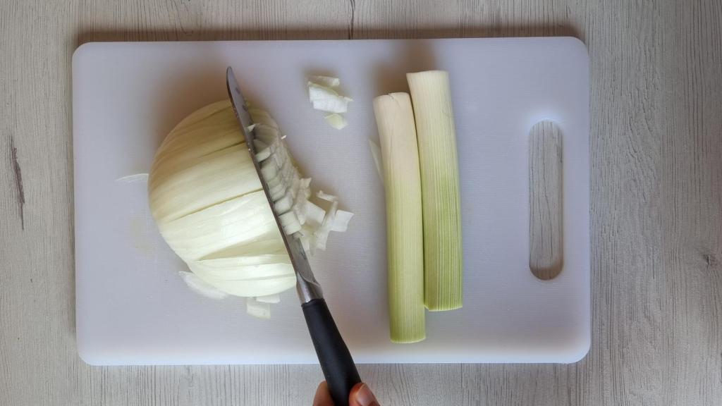 Pelar la cebolla y picarla finamente. Hacer lo mismo con el puerro, quitando la parte verde y también la base del bulbo de la que salen las raíces. Eliminar la capa exterior. Partir por la mitad longitudinalmente para luego cortarlo mejor y picar finamente.