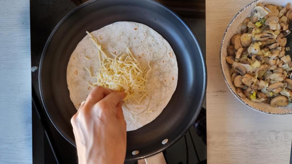 Disponer una sartén, o comal, al calor. Más bien suave para que el queso se funda bien y la tortilla se vaya dorando poco a poco. Rellenar una tortilla con el queso rallado y también con el queso manchego, hay que hacer una mezcla de ambos porque el manchego no es lo suficientemente cremoso. Agregar también dos cucharadas de champiñones y cerrar la tortilla doblándola sobre sí misma.