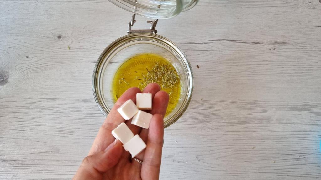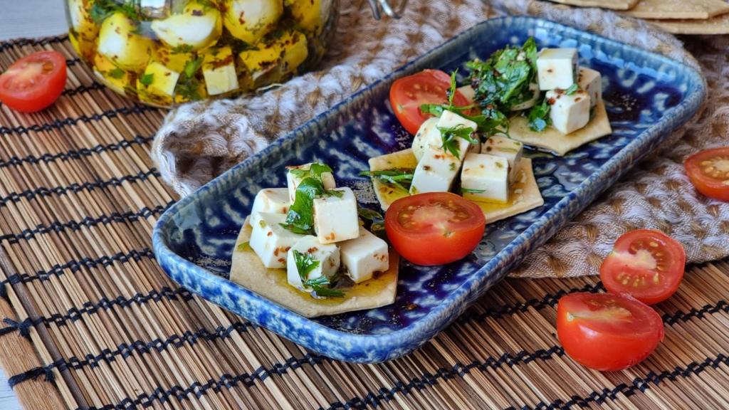 Marinar así estos quesos nos aporta mucho sabor, nos da un toque muy especial y no hará falta hacer nada más que escurrirlos ligeramente y disponerlos después sobre una tosta de pan o cualquier tipo de crackers. Incluso se podría poner sobre un poco de pan crujiente aireado (airbags) o se podrían hacer unos enrollados a partir de pan plano estilo roti o pan plano de yogur y perejil hecho en la sartén.