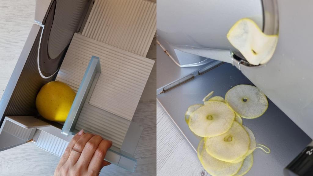 Para la ocasión, se han elaborado de tres maneras diferentes: la clásica con horno, en el microondas y en la freidora de aire. Todas perfectamente válidas y, sorprendentemente, con resultados muy diferentes sobre todo en la forma final. Esta receta sólo requiere de un ingrediente, la manzana. Y es aconsejable utilizar una ligeramente dulce, mejor que las típicas verdes que son más ácidas. Una Golden o una Royal Gala será estupenda. Luego, solo habrá que lavarlas bien y laminarlas finamente pero no demasiado, aproximadamente de 2 milímetros de grosor. Para esta labor podemos utilizar una mandolina o una cortafiambres mejor que el cuchillo que hará más complicada la labor.