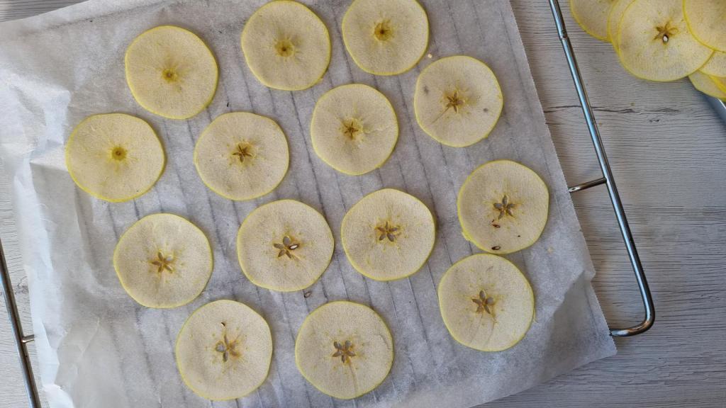 Para hacerlas en el horno, precalentar el horno a 120 ºC y disponer un papel de cocina encima de una rejilla. Poner los chips de manzana bien extendidos e introducir en el horno precalentado con ventilador. Dejar ahí unos 20 minutos, pero ir revisándolo de vez en cuando ya que es muy fácil que pasen de «doradas» a quemadas. Una vez listos los chips de manzana sacar del horno y dejar enfriar hasta que se puedan despegar fácilmente del papel de horno.
