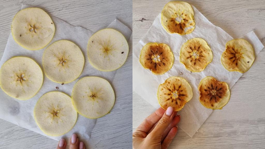 Algo imprescindible será el papel de horno, que nos ayudará luego a despegar los chips de manzana sin que se rompan, y lo pondremos encima de la rejilla en el horno o en la freidora de aire y encima del plato en el microondas. ¿La forma más rápida? En el microondas. ¿La forma de hacer más cantidad? En el horno. ¿Más crujientes y con movimiento? En la freidora de aire. ¡Tenemos para todos los gustos! Importante después conservarlas bien en un recipiente hermético y no pensar en ellas sólo como snack sino también como topping para diferentes postres como por encima de un yogur griego, de una crema de ron, de un arroz con leche o incluso encima de unas islas flotantes.