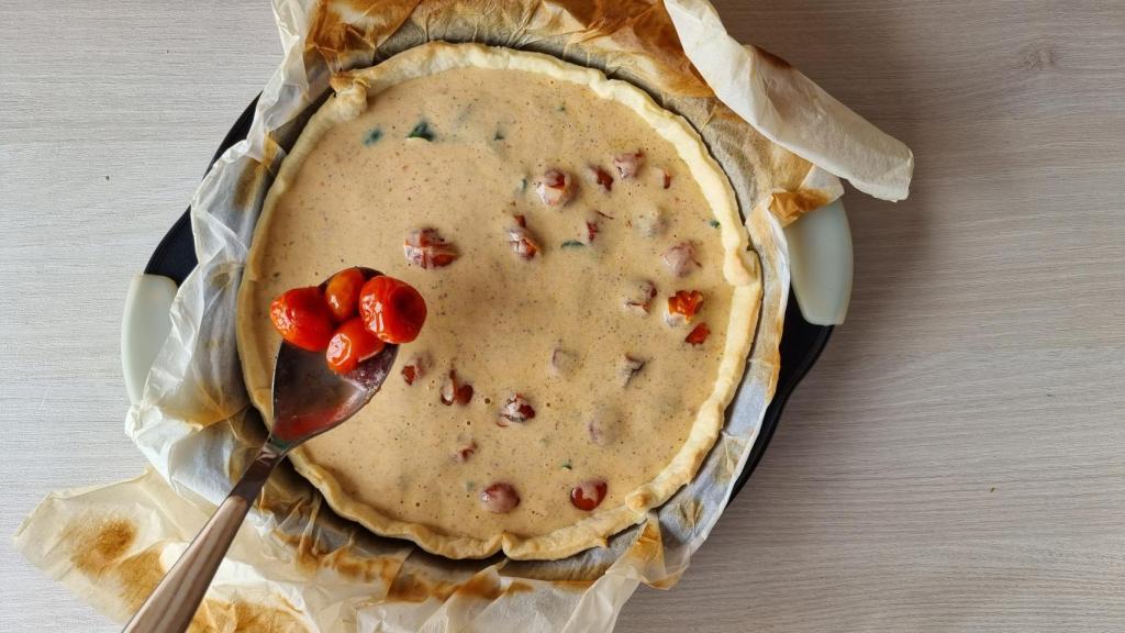Retirar la masa precocida del horno y dejar enfriar ligeramente. Verter la mezcla sobre el molde y terminar por encima con el resto de los tomates cherry.