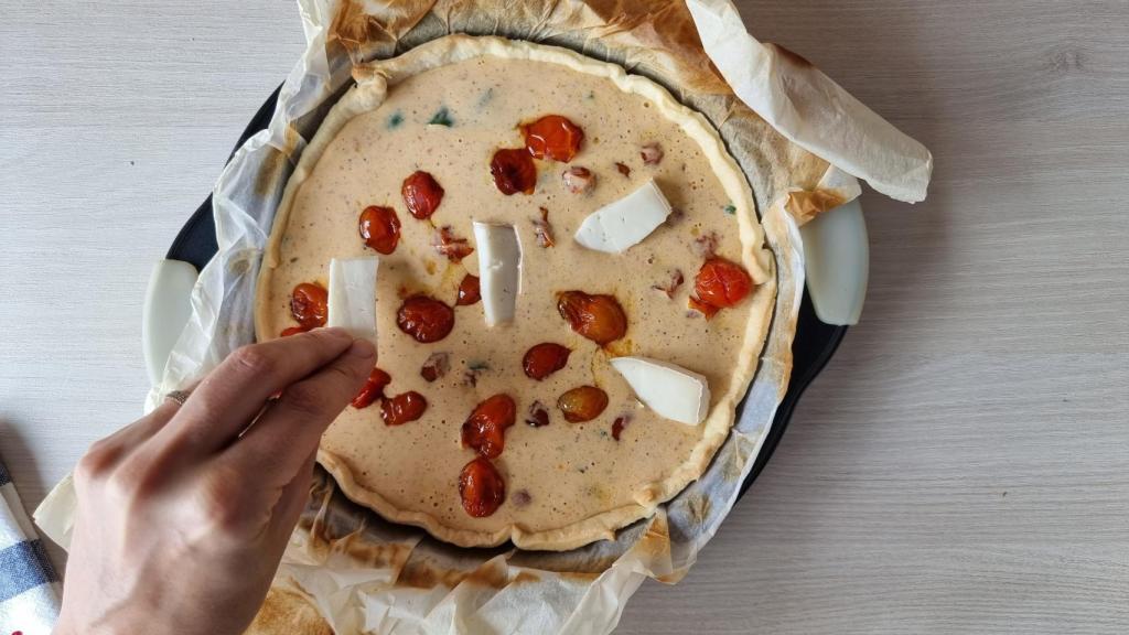 Distribuir los trozos de queso camembert por encima de la mezcla. Hornear durante aproximadamente 30-35 minutos, o hasta que la quiche esté dorada y firme al tacto. Dejar enfriar un poco antes de servir.