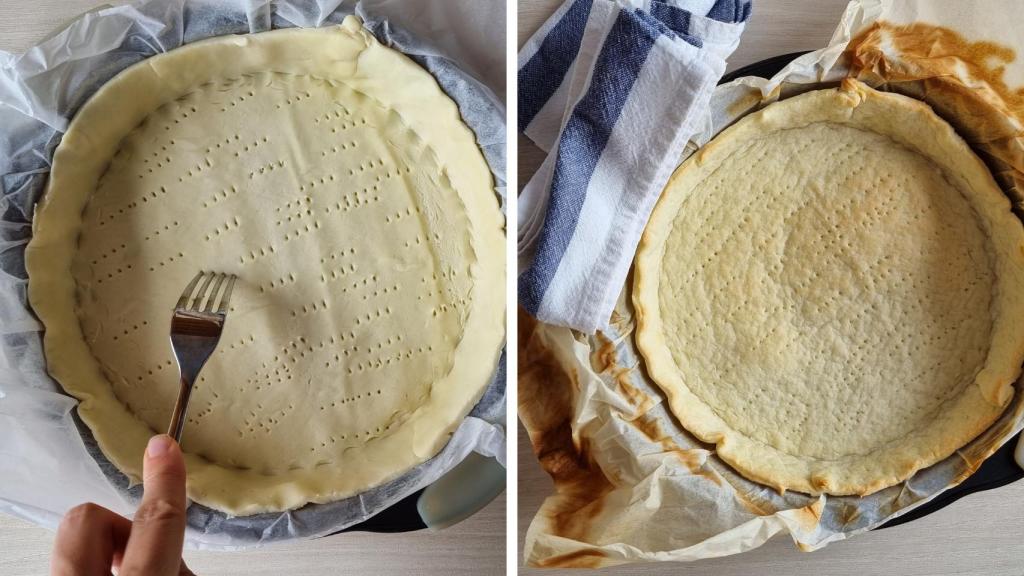 Precalentar el horno a 180 grados. Estirar la masa quebrada sobre su propio papel y forrar un molde para tarta poniendo de base el papel de horno, nos ayudará a que no se pegue. Ajustarla bien y pinchar el fondo de la masa con un tenedor y hornear durante 10 minutos.