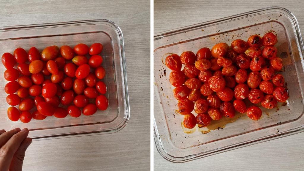 Mientras tanto, colocar los tomates cherry en una bandeja para hornear y rociar con un poco de aceite de oliva. Asar en el horno durante unos 10 minutos, hasta que estén ligeramente caramelizados. También se puede hacer en la freidora de aire durante 8 minutos a 190 ºC.