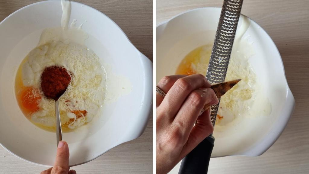 En un bol aparte, batir la nata líquida y los huevos junto con el tomate frito. Sazonar con sal y pimienta al gusto. Añadir el queso parmesano, las hojas de albahaca y la mitad de los tomates cherry.