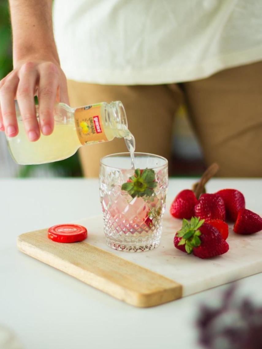 Las fresas maduras son perfectas para aprovecharlas en esta receta con la que llevamos un paso más allá a la limonada tradicional. Para elaborar esta refrescante bebida, solo se necesita limonada de granini (200 ml), fresas maduras y hielo.