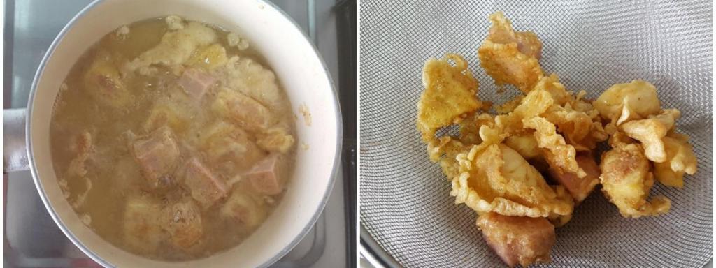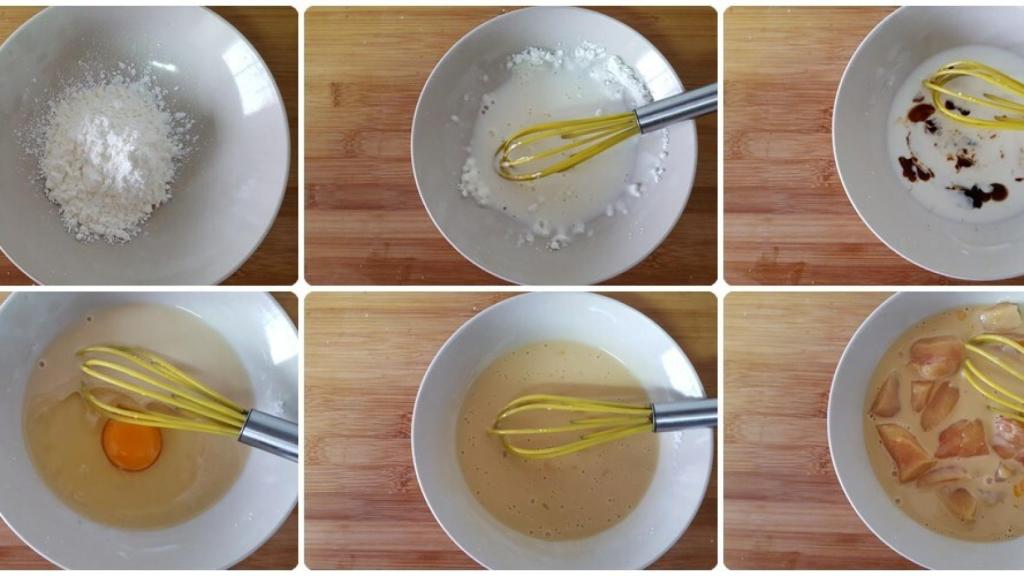 Empezamos preparando el rebozado del pollo, para ello disolvemos la maizena en el agua, añadimos la salsa y el huevo y batimos muy bien. Troceamos la pechuga de pollo en dados, los salpimentamos, los sumergimos en la mezcla y dejamos reposar en la nevera hasta el momento de freírlo.