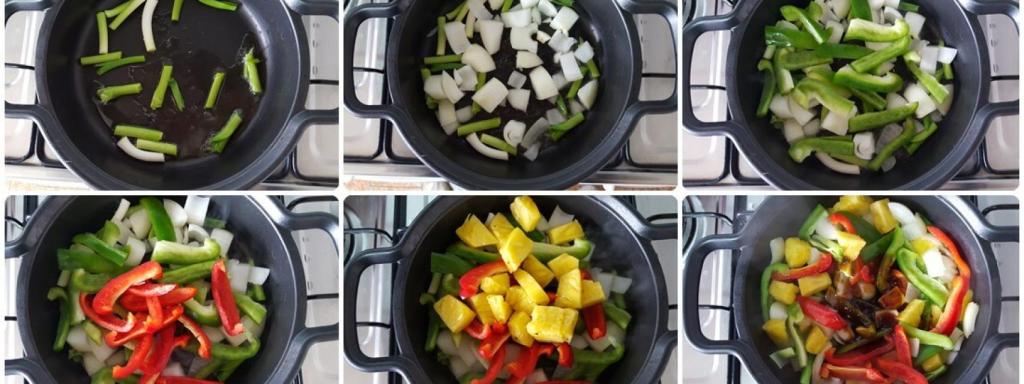 Por otro lado, en una sartén o cacerola baja, o incluso en un wok, ponemos a calentar 2 cucharadas de aceite y salteamos las verduras, primero los ajos tiernos, la cebolla y los pimientos. Salamos ligeramente y salteamos a fuego vivo durante unos minutos sin dejar de remover, añadimos la piña y la salsa, mezclamos todo y bajamos el fuego.