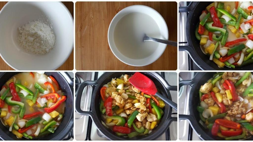 Disolvemos la cucharada de maizena en el agua o el zumo de piña, lo añadimos a la cacerola, mezclamos todo bien, esperamos a que rompa a hervir y añadimos el pollo que teníamos reservado. Mezclamos bien y lo dejamos cocinar durante unos 5 minutos a fuego bajo.