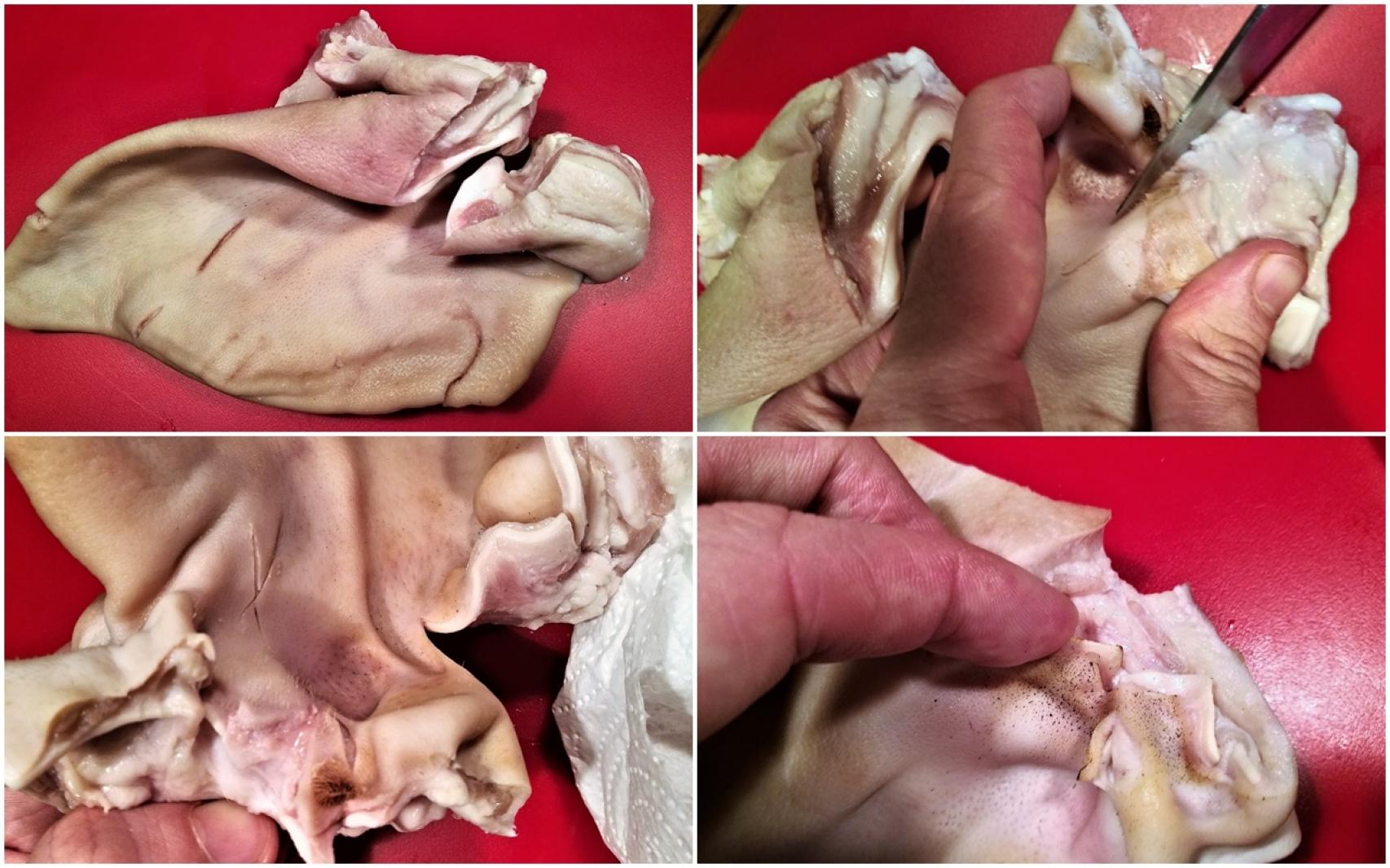 Antes de cocer las orejas de cerdo, primero tenemos que limpiarlas bien. Para ello abriremos con un cuchillo los pliegues de la parte inferior de las orejas y, con la ayuda de un papel de cocina, quitaremos bien la posible suciedad que pudiera tener. Asimismo quemaremos los pelillos que puedan tener con la ayuda de un soplete.