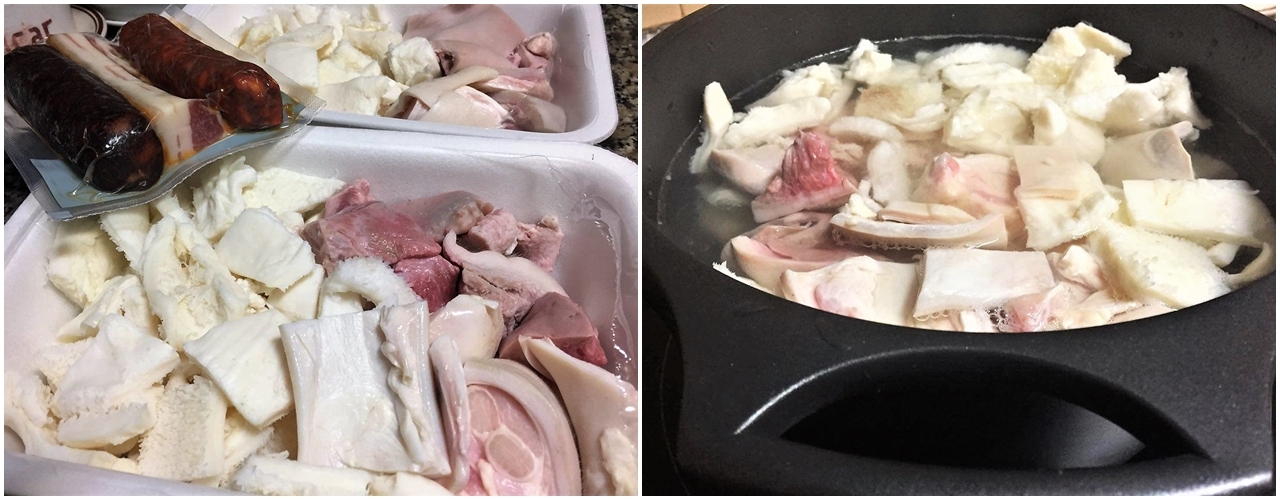 Por otro lado, el morro se escalda y luego se deja perfecto, quemando los pelos y retirando la grasa superficial con un cuchillo. Posteriormente se corta tanto el callo como el morro y se sumerge en agua fría, vinagre y sal durante al menos media hora para su limpieza más exhaustiva.
